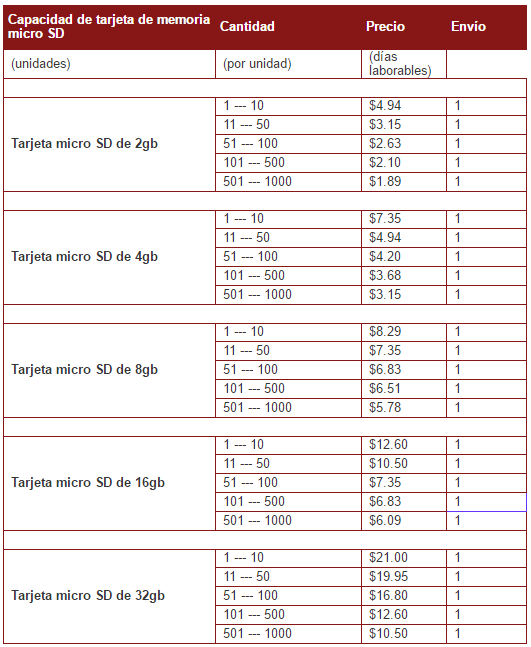 Precios de tarjetas micro SD ofrecidas por el proveedor chino: