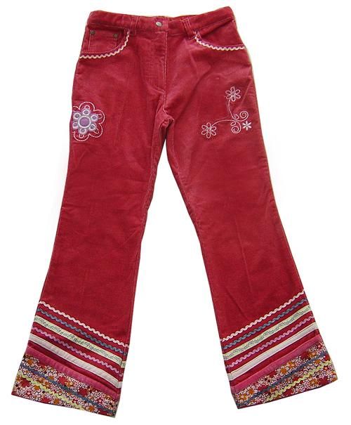 Detalles: Cintura ajustable, aplicaciones en bolsillos delanteros y perneras, cinta tejida + cinta de terciopelo multicolor + popelina estampada, bordados